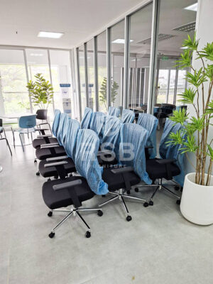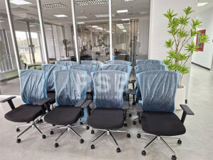 ภาพถ่ายจากหน้างานจัดส่งเก้าอี้สำนักงาน รุ่นพนักพิงสูงและเบาะนั่งกับพนักพิงเอนแยกกัน ภายในห้องประชุม