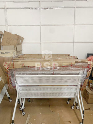 จัดส่งถึงสถานที่ให้เรียบร้อยค่ะ ในภาพเป็นโต๊ะพับล้อเลื่อน โครงขาเหล็กหนา รุ่นมีชั้นวางของ