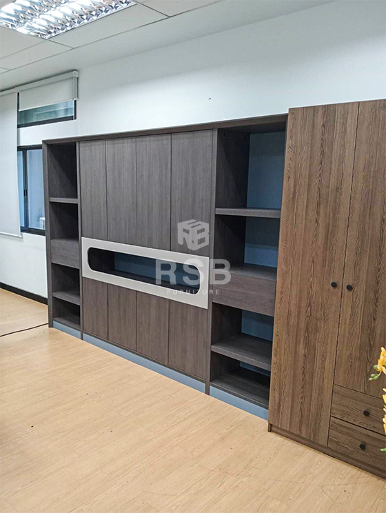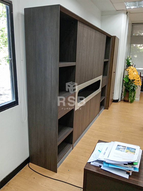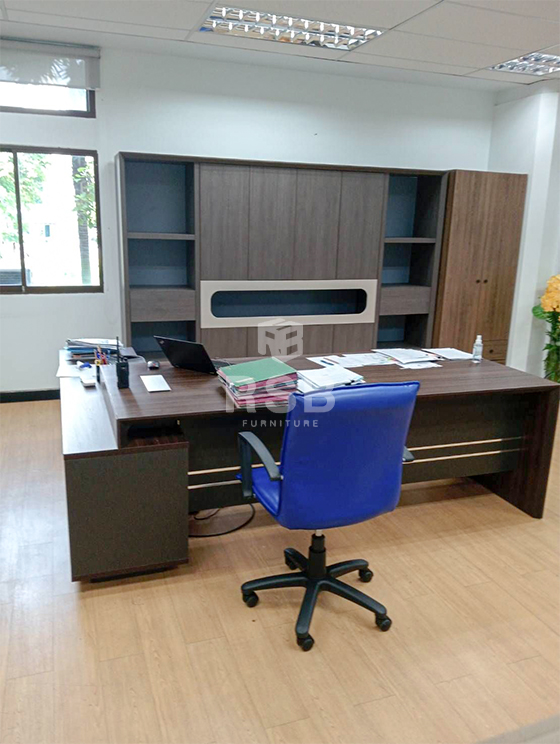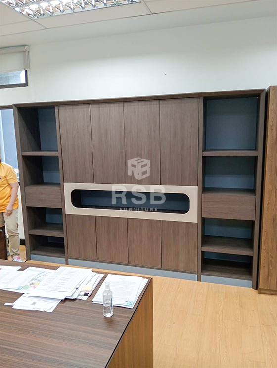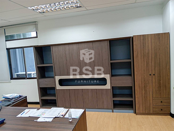 หน้างานนี้ลูกค้าต้องการตู้เอกสารไซด์บอร์ดที่มีสีโทนเดียวกับโต๊ะผู้บริหารที่ลูกค้าเคยซื้อกับทาง RSB ไปใช้งานแล้วค่ะ ได้เลือกเป็นตู้เอกสารไซด์บอร์ด รหัสสินค้า 4739 ไปวางใช้งานในตำแหน่งหลังโต๊ะทำงานค่ะ รุ่นนี้ตู้จะปิดผิวด้วยเมลามีนสีพิเศษโทนสีเข้มๆ เวลาสัมผัสจะให้ความรู้สึกเหมือนไม้ธรรมชาติ ขนาดของตู้ กว้าง 280 cm ลึก 45 cm สูง 200 cm ตอบโจทย์ลูกค้าหน้างานนี้มากเลยค่ะ