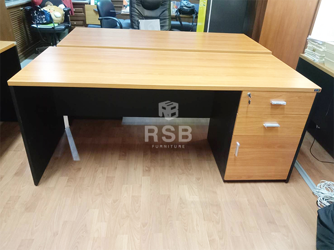 โซนภายในออฟฟิศ หน้างานนี้ลูกค้าได้เลือกใช้โต๊ะทำงานขาไม้ รหัสสินค้า 3444 โต๊ะรุ่นนี้จะมาพร้อมกับ 2 ลิ้นชัก และ 1 บานเปิด มีกุญแจล็อค สามารถเก็บของหรือเอกสารและล็อคได้ ลูกค้าเลือกใช้ ขนาด กว้าง 180 x 60 cm และได้เลือกใช้เมลามีนสีบีชสลับตัดกับสีดำค่ะ