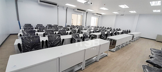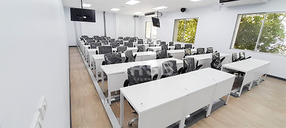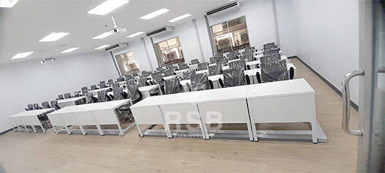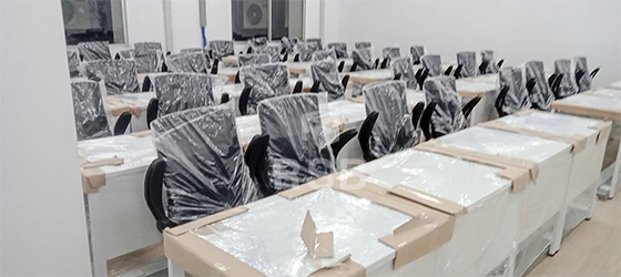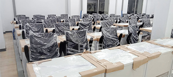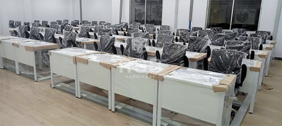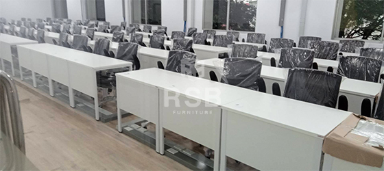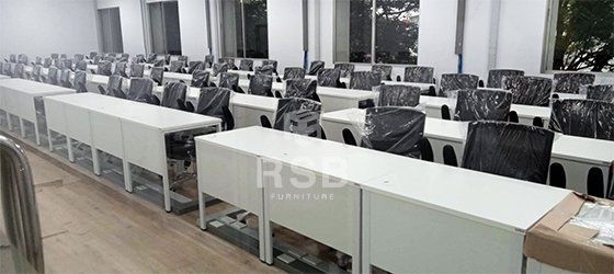 นำภาพถ่ายบรรยากาศจากหน้างานจัดส่งโต๊ะทำงานขาเหล็กพร้อมเก้าอี้ทำงานรุ่นยกแขนขึ้นลงได้ ในภาพจัดส่งเป็นเก้าอี้ทำงาน แขนปรับยกขึ้นลงได้ ช่วยให้สะดวกเวลาเลื่อนเก้าอี้เก็บใต้โต๊ะ เบาะนั่งนุ่มมาก นั่งสบายที่ท้าวแขนด้านบนเสริมฟองน้ำเวลานั่งท้าวแขนนานๆไม่รู้สึกเจ็บ และส่วนโต๊ะใช้เป็นโต๊ะทำงานขาเหล็กตรงพร้อมมีบังหน้า รหัสสินค้า 2602 รุ่นนี้มีให้เลือกหลายขนาดในภาพเลือกใช้ขนาด 120 x 60 cm ลูกค้าหน้างานนี้ยังสั่งปรับแผ่นบังหน้าให้ติดกับท๊อปแบบไม่มีช่อง และยังสั่งเจาะรูสำหรับรอดสายไฟไว้มุมโต๊ะทุกตัว