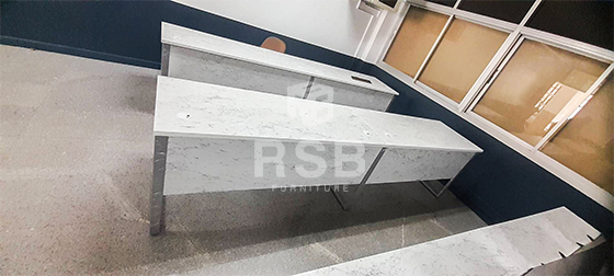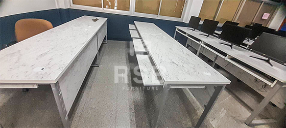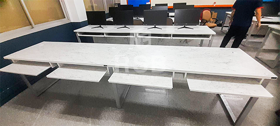 นำตัวอย่างสินค้าเมลามีนลายหินอ่อนล้วนทั้งตัวสีขาวมาฝากค่ะ ลูกค้าหน้างานนี้สั่งซื้อเป็นโต๊ะคอมพิวเตอร์ขาเหล็กกล่อง แบบ 3 ขา รหัสสินค้า 1277 ใช้ขากลางร่วมกัน แบ่งเป็นฝั่งละ 2 ที่นั่ง มีคีย์บอร์ด ทั้งหมด 4 ชุดขาเหล็กหนา รับน้ำหนักได้มาก เลือกใช้เป็นสีเทาค่ะ