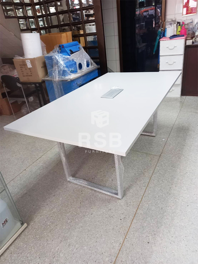 ลูกค้าสั่งซื้อโต๊ะประชุม ขาเหล็กกล่องตัว C ขนาด กว้าง 180 x ลึก 100 ซม. รหัสสินค้า 793 ไปใช้งานค่ะ ได้เลือกสีของท๊อปเป็นสีขาว และขาเหล็กเลือกใช้เป็นสีเทาค่ะ และลูกค้าได้สั่งเจาะรูใส่กล่องปลั๊กไฟเพิ่ม รหัสสินค้า 2419 จะมี POWER 3 + LAN 1 + TEL 1 เป็นระบบฝากดเปิด-ปิดค่ะ