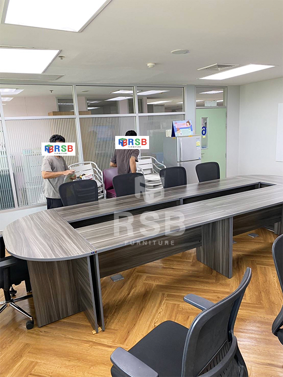จัดส่งและประกอบติดตั้งเรียบร้อยโต๊ะประชุมตัวต่อ ขาไม้ สีกราไฟท์ลายไม้ทั้งตัว ในภาพเลือกใช้เป็นโต๊ะประชุมขนาด กว้าง 480 x ลึก 150 cm รหัสสินค้า 988 ลูกค้าเลือกใช้เป็นสีกราฟไฟท์ล้วน โต๊ะปิดผิวด้วยเมลามีน กันชื้น กันร้อนได้ดีในระดับนึง