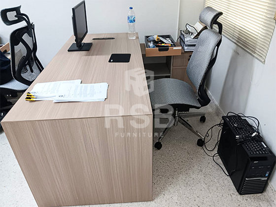 จัดส่งเรียบร้อยโต๊ะผู้บริหารตัวแอล ขนาดกว้าง 180 cm พร้อมเก้าอี้ผ้บริหารหุ้มตาข่ายแบบเหนียว ในภาพโต๊ะตัวแอล พร้อมไซด์บอร์ด มี 2 ลิ้นชัก + ช่องโล่ง 3 ช่อง และบน TOP มีกล่องปลั๊กไฟ พร้อมเสียบปลั๊กใช้งานอยู่ 1 กล่อง รหัสสินค้า 4960 ส่วนเก้าอี้เป็นเก้าอี้ผู้บริหาร ที่นั่งและพนักพิง วัสดุตาข่ายแบบเหนียว เบาะเลื่อนเข้าออกได้ รับน้ำหนัก 120KG รหัสสินค้า 2733
