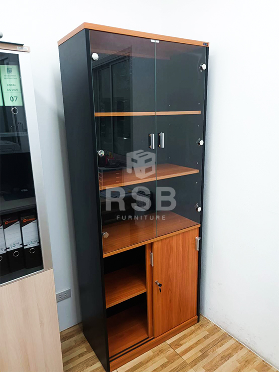 ภาพถ่ายจากหน้างาน จัดส่งและประกอบติดตั้งเรียบร้อย สำหรับตู้เอกสารสูง บานเปิดกระจกด้านบนและบานเลื่อนด้านล่างพร้อมมีกุญแจล็อค ตู้ปิดผิวด้วยเมลามีน สามารถเลือกสั่งผลิตสีได้ ในภาพลูกค้าสั่งผลิตสีเชอรี่ตัดกับสีดำค่ะ รหัสสินค้า 2071