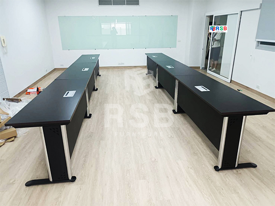 จัดส่งเรียบร้อย ลูกค้าเลือกสั่งซื้อโต๊ะทำงานขาเหล็กปั้มเงา แบบโล่งมีบังหน้า รหัสสินค้า 1042 ไปเรียบต่อกัน 2 แถว ทำเป็นโต๊ะประชุมค่ะ และสั่งเจาะรูใส่กล่องรอดสายไฟบนท๊อปตรงกลางด้านมุมบนเพิ่ม และเลือกโต๊ะเมลามีนสีดำทั้งตัวค่ะ