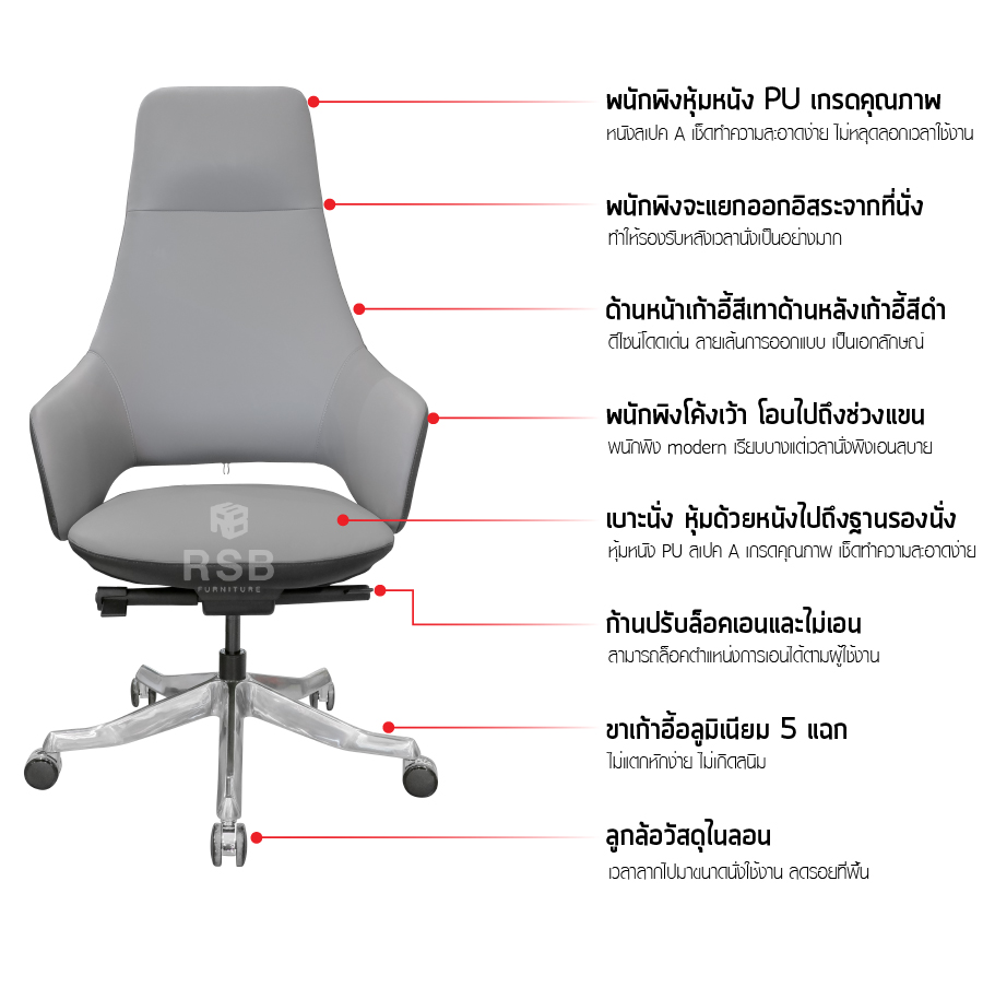 – พนักพิงและที่นั่ง หุ้มด้วยหนัง PU สเปค A เกรดคุณภาพ เช็ดทำความสะอาดง่าย ไม่หลุดลอกเวลาใช้งาน
