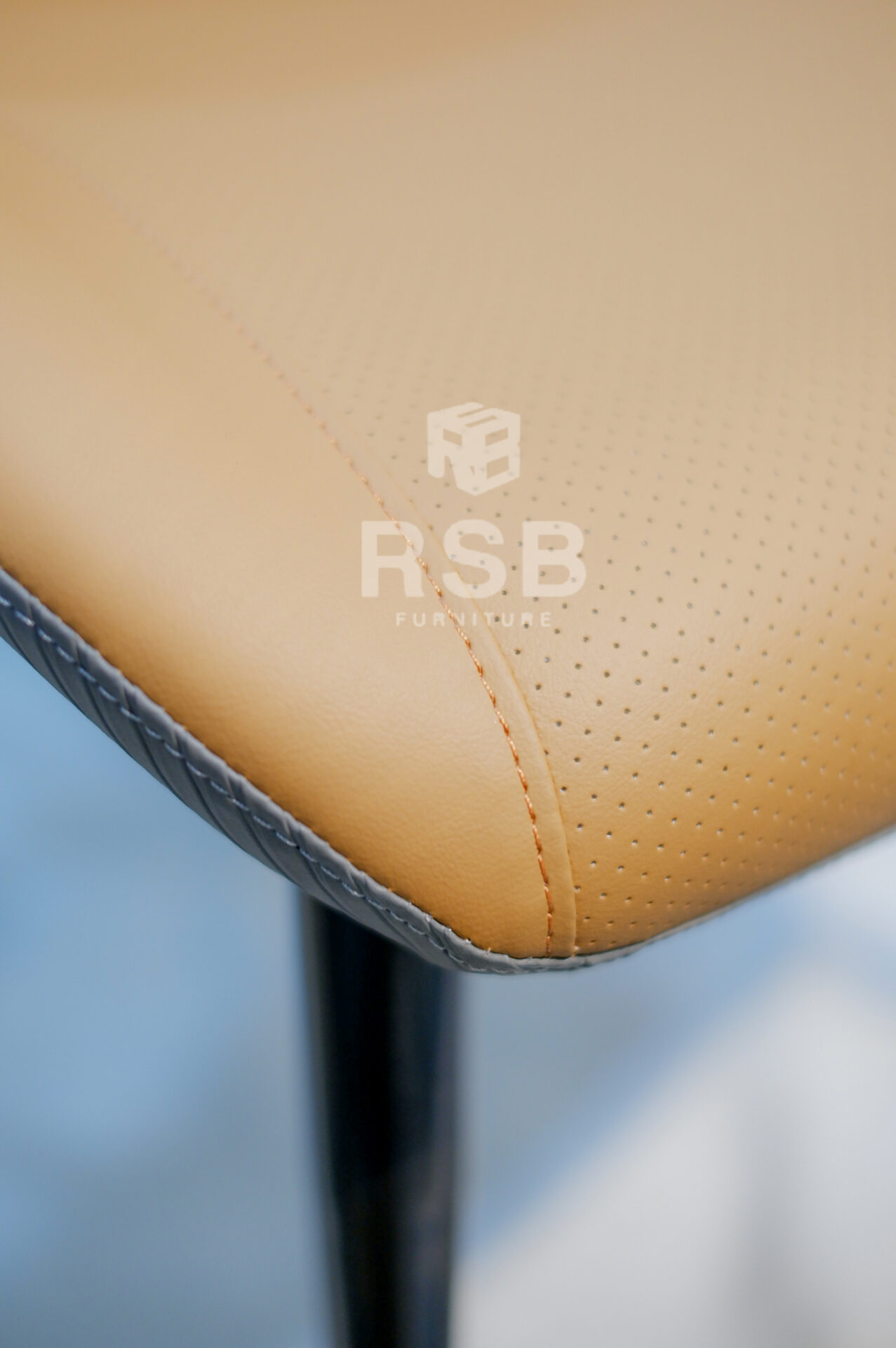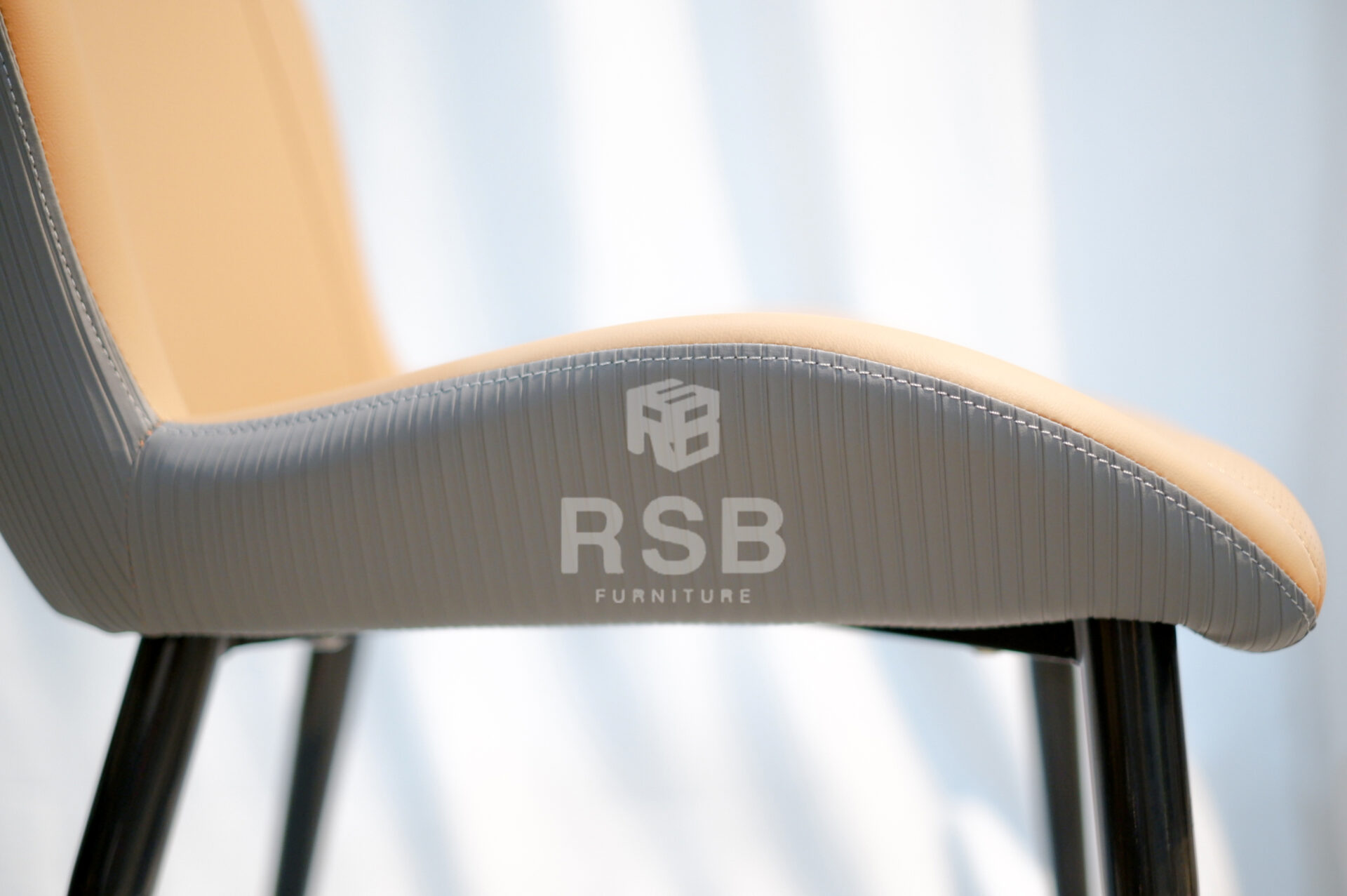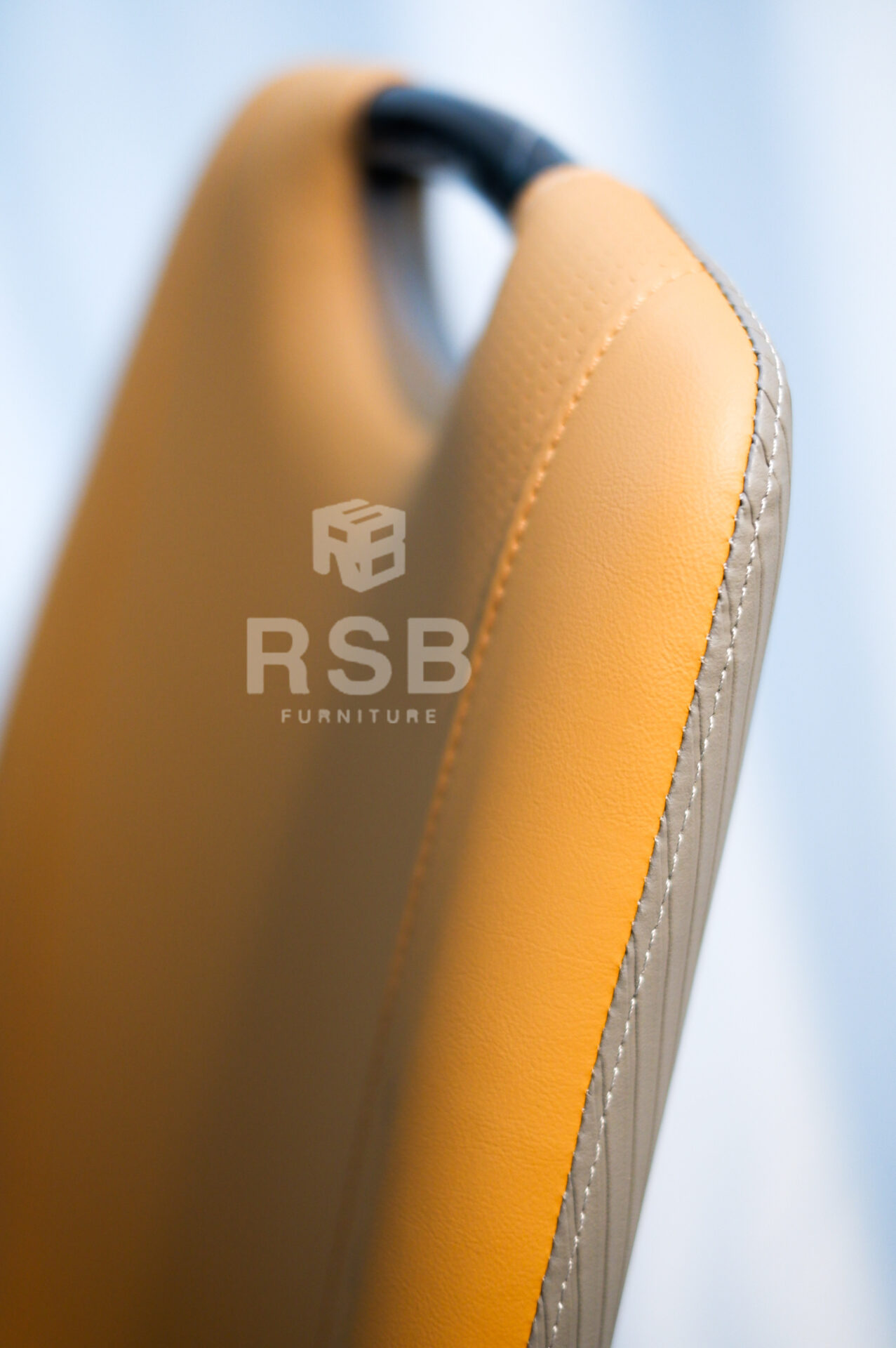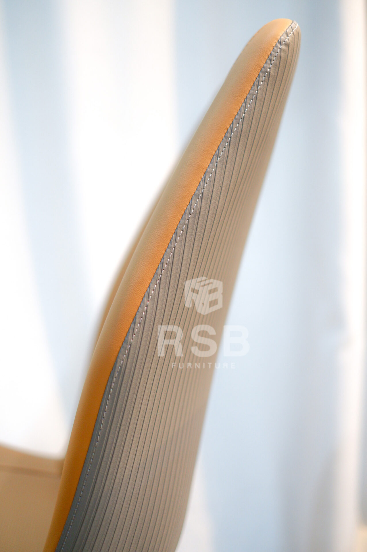– พนักพิงหลังสีเทา เดินลายหนังแบบลายเส้นกราฟฟิค ให้ความรู้สึก Craft work ด้านหน้าสีน้ำตาล ดีไซน์เป็นจุดช่วยระบายความอากาซและความชื้น เหมือนเบาะรถยนต์