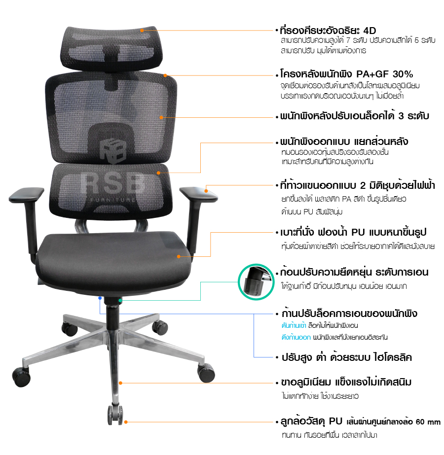 – เก้าอี้ Ergonomic ปรับทุกตำแหน่งให้รองรับการ การพิงเอนใช้งาน ของผู้นั่งที่สุด
