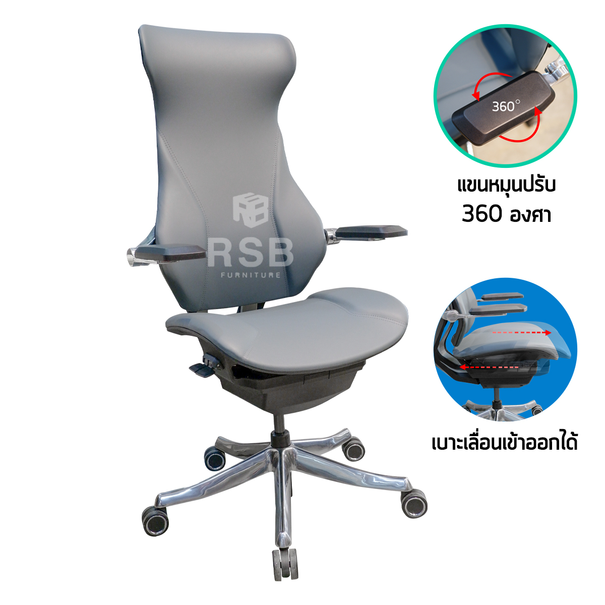 – ที่ท้าวแขนอลูมิเนียม ด้านบนหุ้มยาง PU ยกขึ้น-ลงได้ สามารถหมุนได้ 360 องศา สามารถหมุนเลือกฝั่ง ในด้านมุมที่เหมาะกับผู้นั่ง