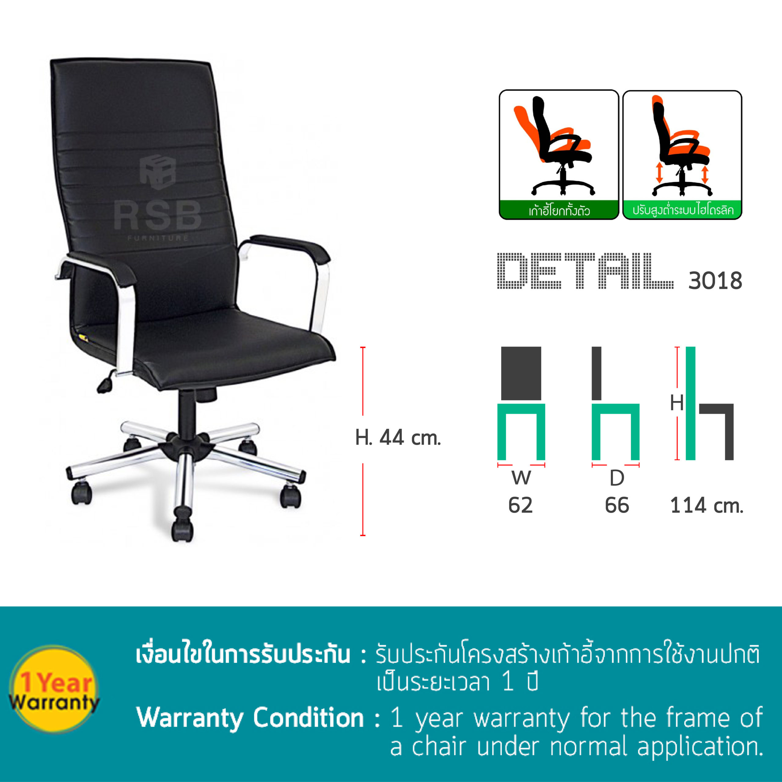 – ที่ท้าวแขนทำจากเหล็กชุบโครเมี่ยม ด้านบนปิดทับด้วยหนัง PU เกรด A อีกชั้น