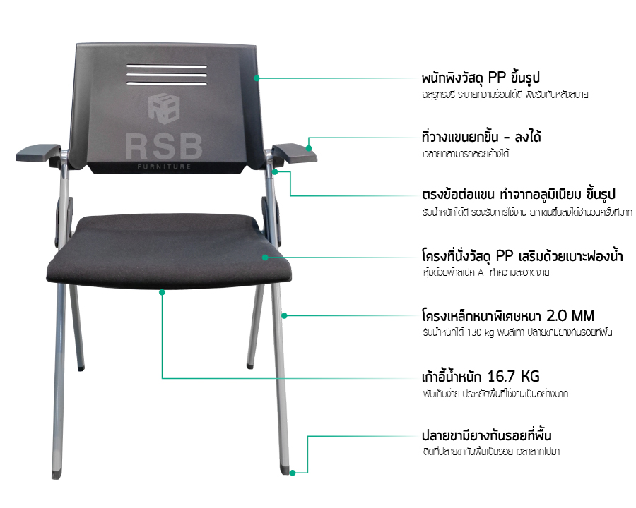 – โครงที่นั่งวัสดุ PP ขึ้นรูป เสริมด้วยเบาะฟองน้ำ และหุ้มด้วยผ้าสเปค A ทำความสะอาดง่าย