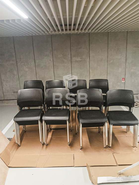 หน้างานนี้ลูกค้าต้องการเก้าอี้สำหรับจัดอบรม ได้เลือกใช้เป็นเก้าอี้พนักพิงและที่นั่ง วัสดุ PP หนาแข็งแรง สามารถเรียงซ้อนเก็บได้เยอะ โครงเก้าอี้เป็นเหล็กทรงกลมขนาด 25 mm หนา 1.2 mm ชุบโครเมียมเงามีคานเหล็กรองรับใต้เก้าอี้ วัสดุแข็งแรง