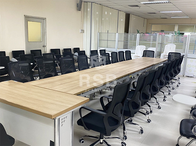 จากรูป ลูกค้าใช้งานโต๊ะทำงานขาเหล็กกล่อง แบบโล่ง รหัสสินค้า 3256 ต่อกันเป็นโต๊ะประชุมแบบแถวยาว ใช้ โต๊ะทำงานขาเหล็ก 3 ตัว พร้อมใช้โต๊ะทำงานขาเหล็กปั้มเงา รหัสสินค้า 1042 ต่อกันเป็นโต๊ะหัวประธาน 1 ตัวค่ะ เรียงเป็นแถวตรงยาวประหยัดพื้นที่ ใช้ท๊อปเป็นเมลามีนสีคาปู ทั้ง 2 รุ่นค่ะ ส่วนเก้าอี้ใช้งานเก้าอี้ทำงาน รหัสสินค้า 4455 รุ่นนี้พนักพิงเต็มหลัง เบาะกว้าง นั่งสบายค่ะ