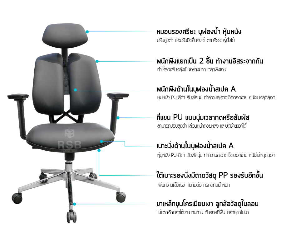 – พนักพิงแยกเป็น 2 ชิ้น ทำงานอิสระจากกัน จะทำงานตามน้ำหนักแรงกดทับ น้ำหนักเวลาพิง ทำให้รองรับหลังเป็นอย่างมาก เวลาพิงเอน