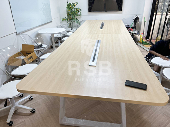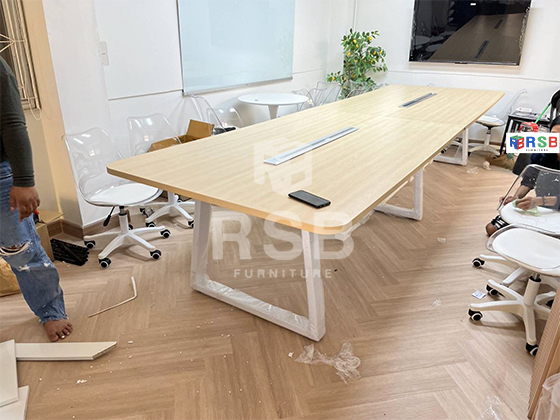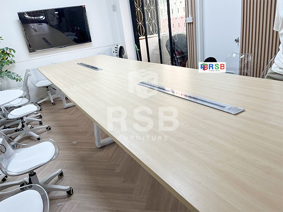 นำรีวิวภาพถ่ายจากหน้างานจัดส่งและประกอบติดตั้งโต๊ะประชุมขาเหล็กกล่อง หน้าใหญ่พิเศษ ทรงสามเหลี่ยมมาฝากค่ะ ลูกค้าเลือกใช้เป็นโต๊ะประชุม ตัดต่อ ขาเหล็กกล่อง ขนาดกว้าง 240 cm และสั่งพิเศษลบมุมออกทั้ง 4 ด้าน รุ่นนี้ขาเหล็กกล่องมี 3 ขา กระจายการรับน้ำหนักได้อย่างดี สามารถเลือกสั่งสีของท๊อปและขาเหล็กได้ ลูกค้าได้เลือกท๊อปสีบีชและขาเหล็กสีขาว สวย โมเดิร์นมาก และได้สั่งเจาะรูใส่รางไฟแบบยาว รหัสสินค้า 4829 ขนาดรางไฟกว้าง 100 cm จำนวน 2 จุดบนท๊อปด้วยค่ะ
