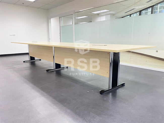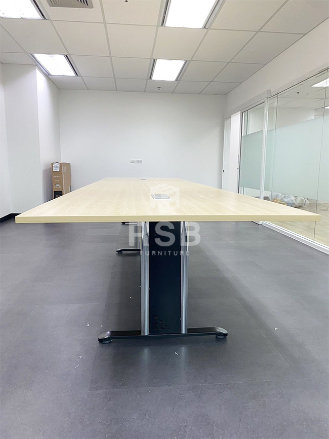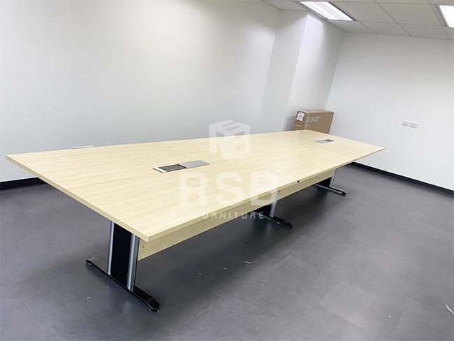ในห้องประชุมที่มีผู้เข้าประชุมจำนวนมากอาจจะเลือกเป็นโต๊ะประชุมตัวยาวตัวเดี่ยวไปเลยเพื่อประหยัดพื้นที่ค่ะ รุ่นที่ลูกค้าเลือกจะเป็นโต๊ะประชุม แบบตัวต่อ 3 ขา ท๊อปทรงสี่เหลี่ยม รหัส 1386 ค่ะ ส่วนบนท็อปลูกค้าได้สั่งเจาะรูใส่กล่องปลั๊กไฟเพิ่มค่ะ เลือกใช้เป็นกล่องปลั๊กไฟ Stainless ฝาสไลด์ รหัส 3446 มี 2 POWER + 1 HDMI + 1 LAN + 2 USB และมาพร้อมกับ สายไฟและปลั๊ก เสียบใช้งานได้ทันที เวลาประชุมสามารถใช้โน็คบุ็คได้สบายๆค่ะ ตัวท๊อปและบังหน้าลูกค้าเลือกเป็นสีเมเปิ้ลล้วนทั้งตัว ทำให้ห้องดูสว่างมากขึ้น ตัดกับสีพื้นโทนหม่นๆค่ะ