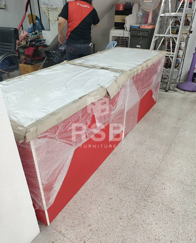 ภาพถ่ายสินค้าจากหน้างานจริงที่ทางเราได้นำไปส่งค่ะ หน้างานนี้ลูกค้าได้เลือกซื้อโต๊ะทำงานขาไม้ไปใช้งานที่โชว์รูมขายรถจักรยานยนต์ฮอนด้าค่ะ ได้เลือกซื้อโต๊ะทำงานขาไม้ แบบมี 2 ลิ้นชัก มีกุญแจล็อค สั่งทำบังหน้าแบบเต็มพื้นค่ะ ลูกค้านำไปต่อกัน 2 ตัว เป็นเคาน์เตอร์หน้าร้าน และได้เลือกสีเมลามีนสีแดงตัดกับสีขาว เพราะเป็นสีเดียวกับโลโก้ลูกค้าค่ะ