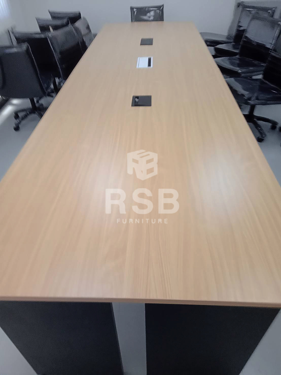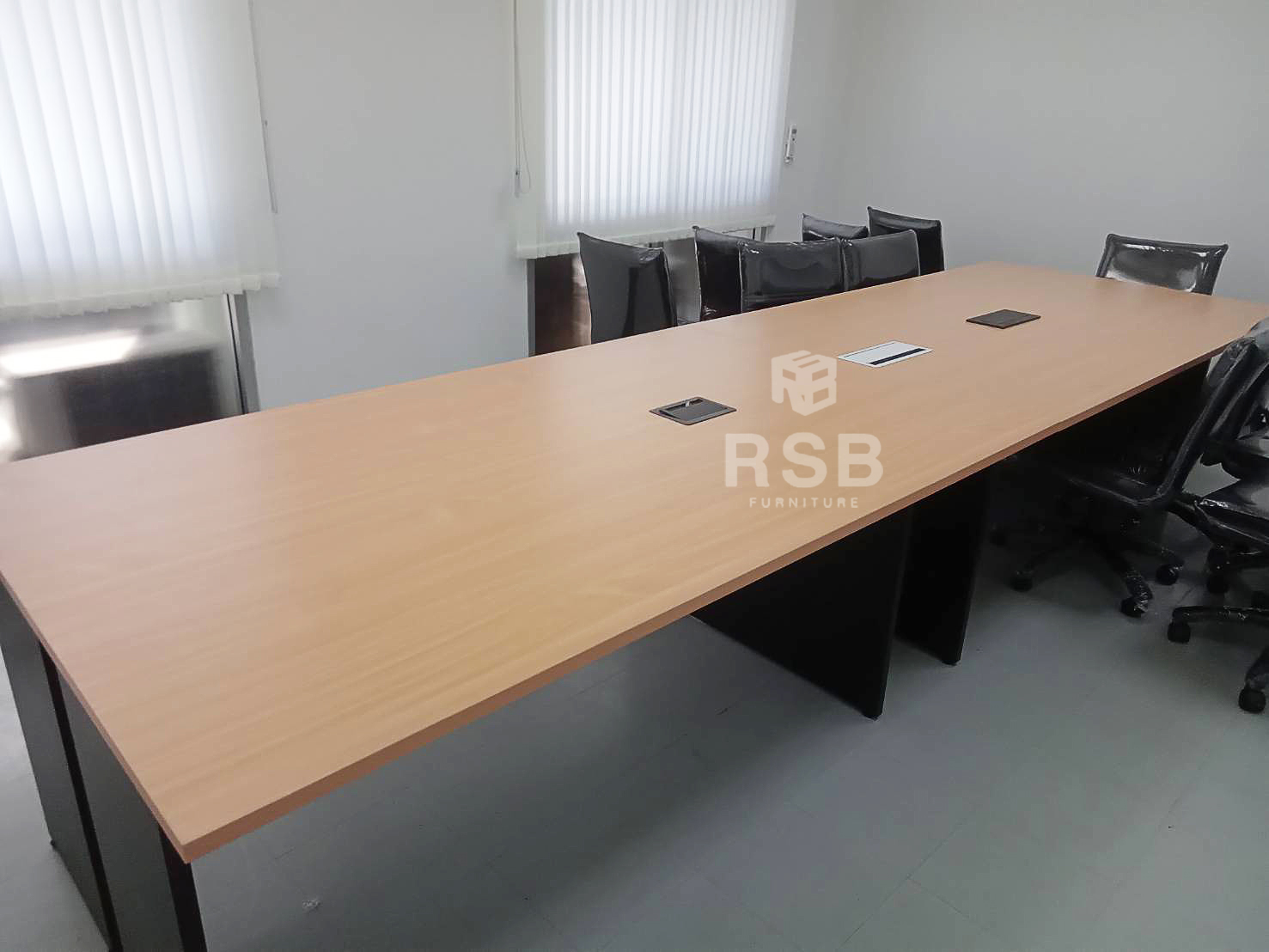 หน้างานนี้จัดส่งโต๊ะประชุมขาไม้ รหัส 1108 ค่ะ ขนาดของโต๊ะ 480 x 120 cm. ลูกค้าสั่งทำแบบไม่เจาะรูรอดสายไฟตรงกลางแนวยาวค่ะ แต่ได้สั่งเป็นเจาะรูใส่กล่องปลั๊กไฟ 3 จุดค่ะ และเลือกท๊อปเมลามีนสีบีช ส่วนขาเลือกเมลามีนสีดำค่ะ ส่วนเก้าอี้ประชุมเลือกใช้เป็นเก้าอี้สำนักงาน แบบไม่มีที่ท้าวแขน รหัส 1638 ค่ะ