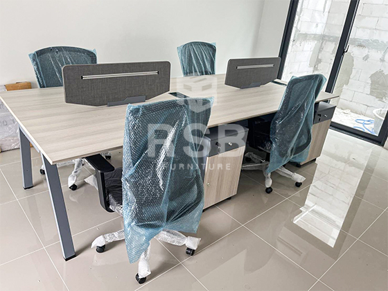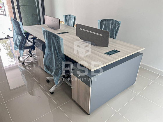 ในภาพจัดส่งโต๊ะทำงานกลุ่มแบบ 2 ที่นั่ง ขนาด กว้าง 140 ลึก 120 cm ลูกค้าสั่งตัวต่อโต๊ะเพิ่ม เป็น 4 ที่นั่ง สามารถซื้อตัวต่อ มาวางเชื่อมชนต่อกันได้ โดยตัวต่อจะใช้ขาร่วมกันกับตัวแรก ทำให้ตัวที่จะมาต่อ ราคาถูกลง โต๊ะ มี 1 ลิ้นชัก 1 บานเปิด พร้อมกุญแจล็อคแบบรหัส แยกกัน ทั้ง 2 ฝั่งตรงข้าม และฉากกั้นตรงกลาง รหัสสินค้า 4736 และเก้าอี้ทำงานที่เลือกใช้ เก้าอี้สำนักงาน พนักพิงหลังใหญ่ พิงเอนนั่งสบาย รหัส 5072