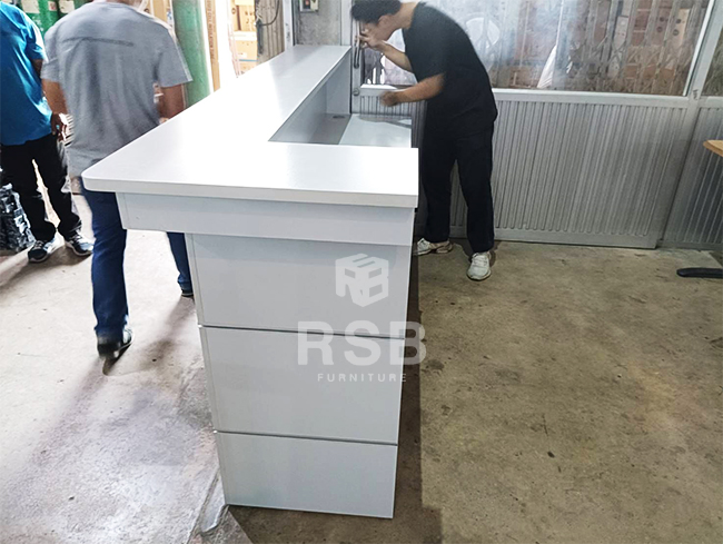 เป็นโซนประชาสัมพันธ์ค่ะ ได้เลือกเป็นเคาน์เตอร์ Reception ค่ะ รหัสสินค้า 2981 จะมี 3 ลิ้นชักระหว่างตรงกลางสำหรับวางเอกสารหรือแฟ้มค่ะ และมีรางคีย์บอร์ดแยก 2 ฝั่งค่ะ รุ่นนี้จะมีสีให้เลือกหลายสีเลยค่ะ ลูกค้าต้องการให้ตู้มีสีไม่โดดเด่นจนเกินไป เลยได้เลือกสีน้ำเงิน ตัดกันกับสีขาวค่ะ รุ่นนี้ลักษณะมีรูปทรงที่สวยใช้งานได้ค่อนข้างดี และราคาไม่ได้แพงมาก จึงเป็นที่นิยมใช้ค่ะ