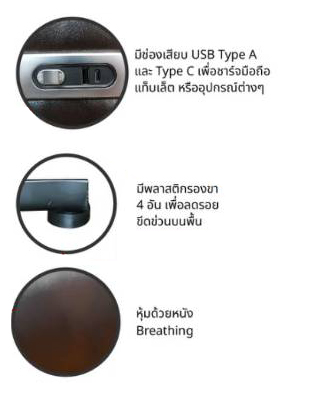 – ด้านข้างเก้าอี้ มีช่องเสียบ USB Type A และ Type C เพื่อชาร์จมือถือ แท็บเล็ต หรืออุปกรณ์ต่างๆ