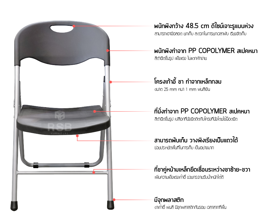 – พนักพิงกว้าง 48.5 cm ดีไซน์เจาะรูแบบห่วง สามารถเอามือสอด ยกเก็บ สะดวกในการยกเวลาพับ เรียงจัดเก็บ