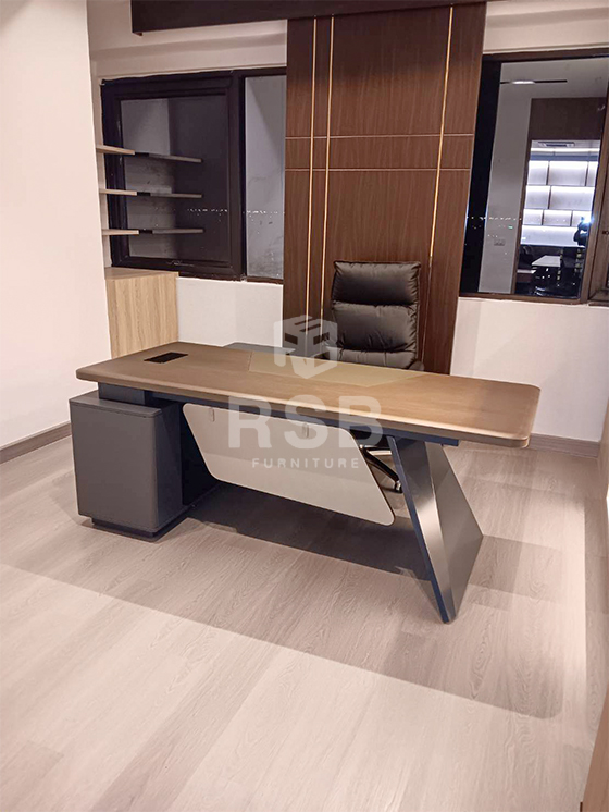มาดูตัวอย่างหน้างานโซนห้องทำงานของผู้บริหารกันค่ะ หน้างานนี้ลูกค้าได้เลือกซื้อโต๊ะทำงานและเก้าอี้ไปใช้ ได้เลือกเป็นสไตล์คลาสสิกทั้งตัวโต๊ะและตัวเก้าอี้เลยค่ะ โต๊ะได้เลือกใช้โต๊ะผู้บริหาร Design work ขาโต๊ะวางมุมเฉียง ขนาดโต๊ะ 200 x 165 cm พร้อมไซด์บอร์ดข้างด้านขวา รหัส 4326 ตรงกลางผิวสัมผัสยาง และเลือกใช้เก้าอี้ผู้บริหารสไตล์คลาสสิคเก้าอี้ผู้บริหาร รุ่นที่นั่งพนักพิงหนานุ่ม รหัส 4864 รุ่นนี้จะหุ้มด้วยหนังPU ทั้งตัวค่ะ พอนำไปไว้ในห้องของลูกค้าแล้วสวยมากๆค่ะ