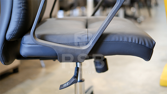 – ฐานใต้เก้าอี้ มีก้อนโยกหมุนปรับ ความหนืดของพนักพิง เอนน้อยเอนมากได้