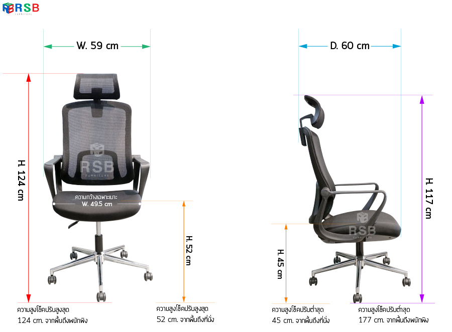 – ขนาดกว้าง 59 x ลึก 60 x สูง 117-124 cm (ความกว้างเฉพาะเบาะ 49.5 cm)