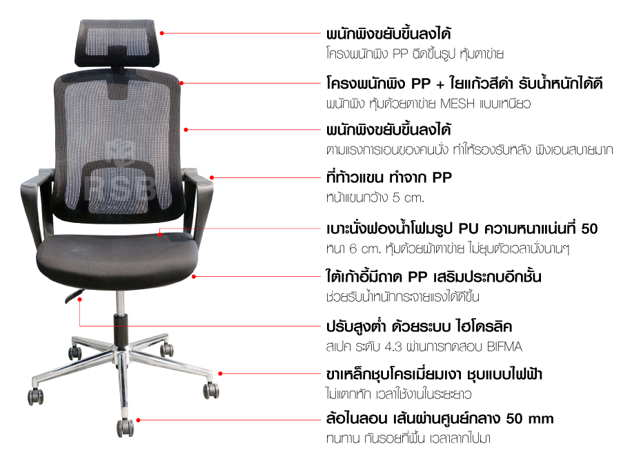 – ใต้เก้าอี้มีถาด PP เสริมประกบอีกชั้น ช่วยรับน้ำหนักกระจายแรงได้ดีขึ้น
