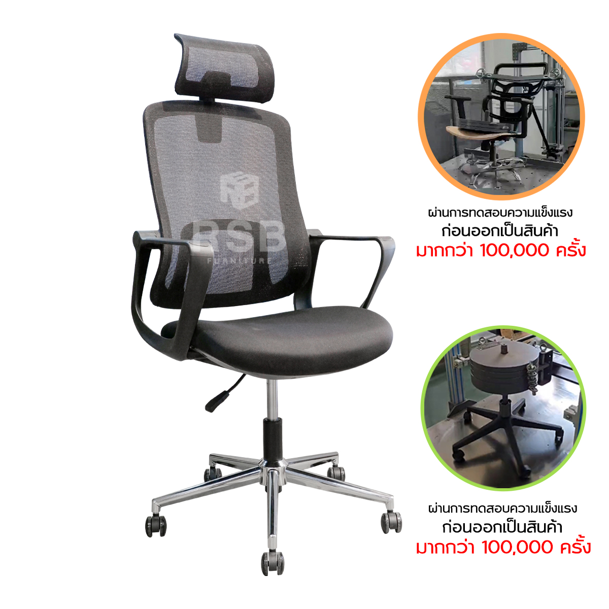 – ผ่านการทดสอบ เรื่องความแข็งแรง ก่อนออกมาเป็นผลิตภัณฑ์ได้ โดยเครื่องจักร ดึงที่พนักพิง และที่นั่ง ซ้ำๆเดิมๆ ด้วยแรงดึง 127.9 KG มากกว่า 100,000 ครั้ง