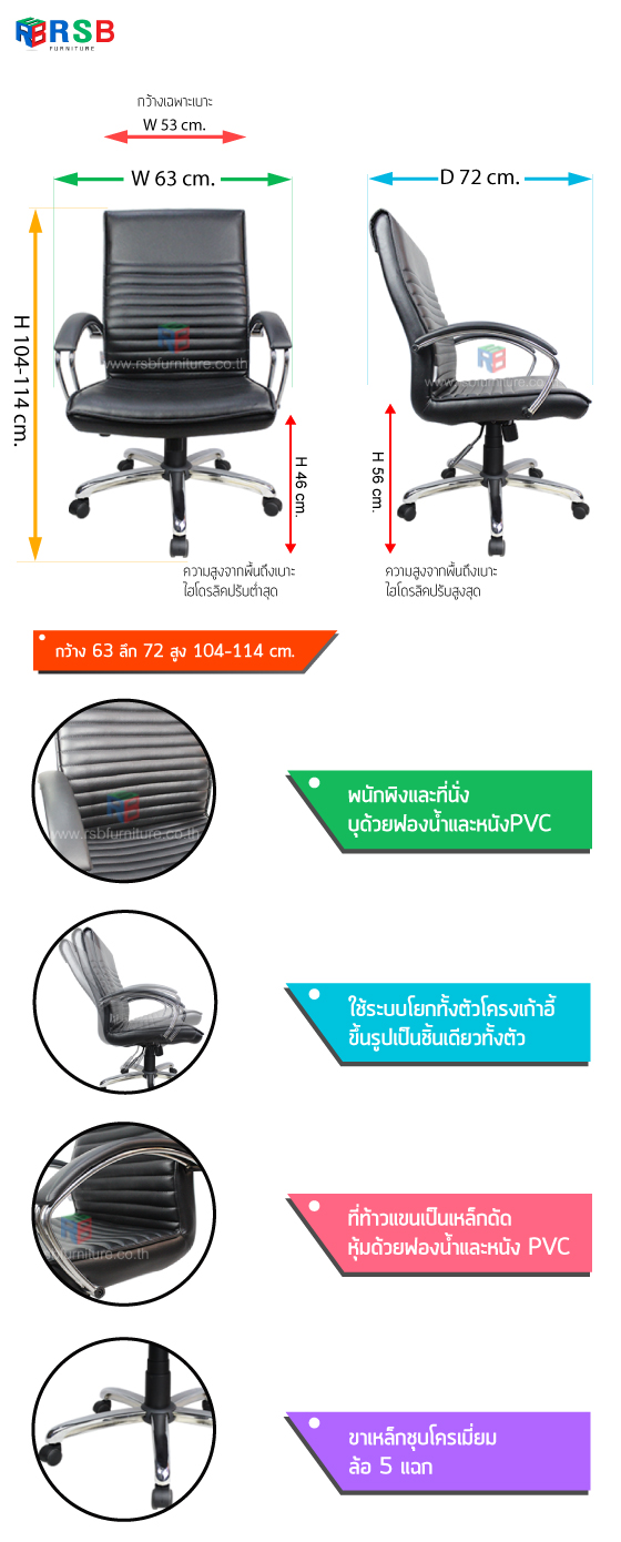 – กว้าง 63 cm ลึก 72 cm สูง 104-114 cm ความกว้างเฉพาะเบาะ 53 cm