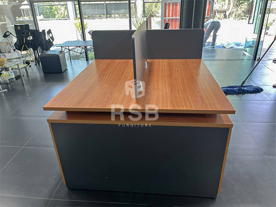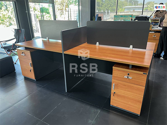 โซนทำงานในออฟฟิศค่ะ หน้างานนี้ลูกค้าได้เลือกซื้อโต๊ะทำงานกลุ่มขาไม้แบบ 4 ที่นั่ง พร้อมฉากกั้น รหัสสินค้า 3803 ลูกค้าต้องการโต๊ะทำงานกลุ่มที่ประหยัดพื้นที่ ถึงแม้ว่าจะเป็นโต๊ะทำงานกลุ่มที่มาพร้อมตู้เอกสารและฉากกั้นก็ประหยัดพื้นที่ มี 1 ลิ้นชักและ 1 บานเปิดสำหรับเก็บของให้แต่ละที่นั่ง และเลือกสีเมลามีนเป็นสีเชอรี่ตัดสีกราไฟท์ ฉากกั้นก็เลือกเป็นสีกราฟไฟท์ให้เข้ากันกับสีของโต๊ะค่ะ