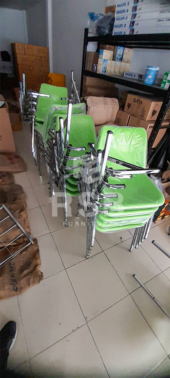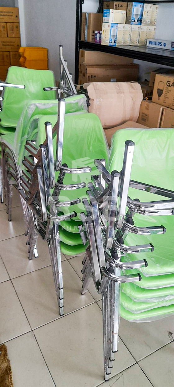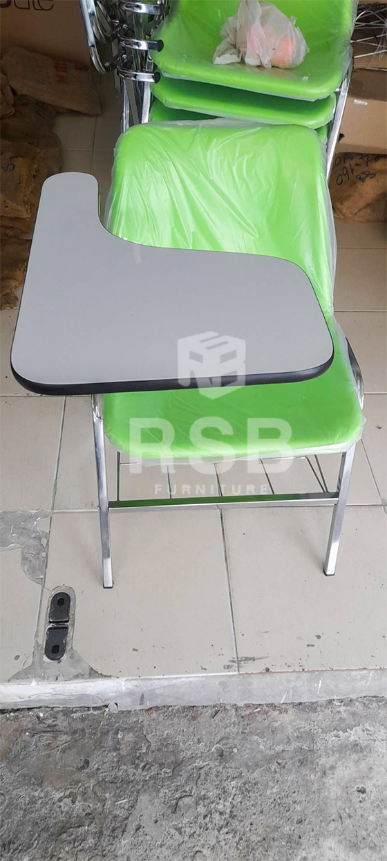 หน้างานนี้ลูกค้าต้องการเก้าอี้เลคเชอร์ ได้เลือกใช้เป็นเก้าอี้เลคเชอร์ที่นั่งพนักพิงวัสดุ โพลี (พลาสติกอัดหนา) รหัสสินค้า 1413 รุ่นนี้มีตะแกรงวางของวางกระเป๋าหรือวางขวดน้ำได้ แผ่นเลคเชอร์ยกขึ้นได้สะดวกเวลาลุกนั่ง เป็นไม้ปิดผิวด้านบนด้วยโฟเมก้า กั้นน้ำได้ โครงขาเหล็กชุบโครเมียมเงา สามารถเลือกสีของโพลีได้ ลูกค้าเลือกใช้สีเขียวค่ะ