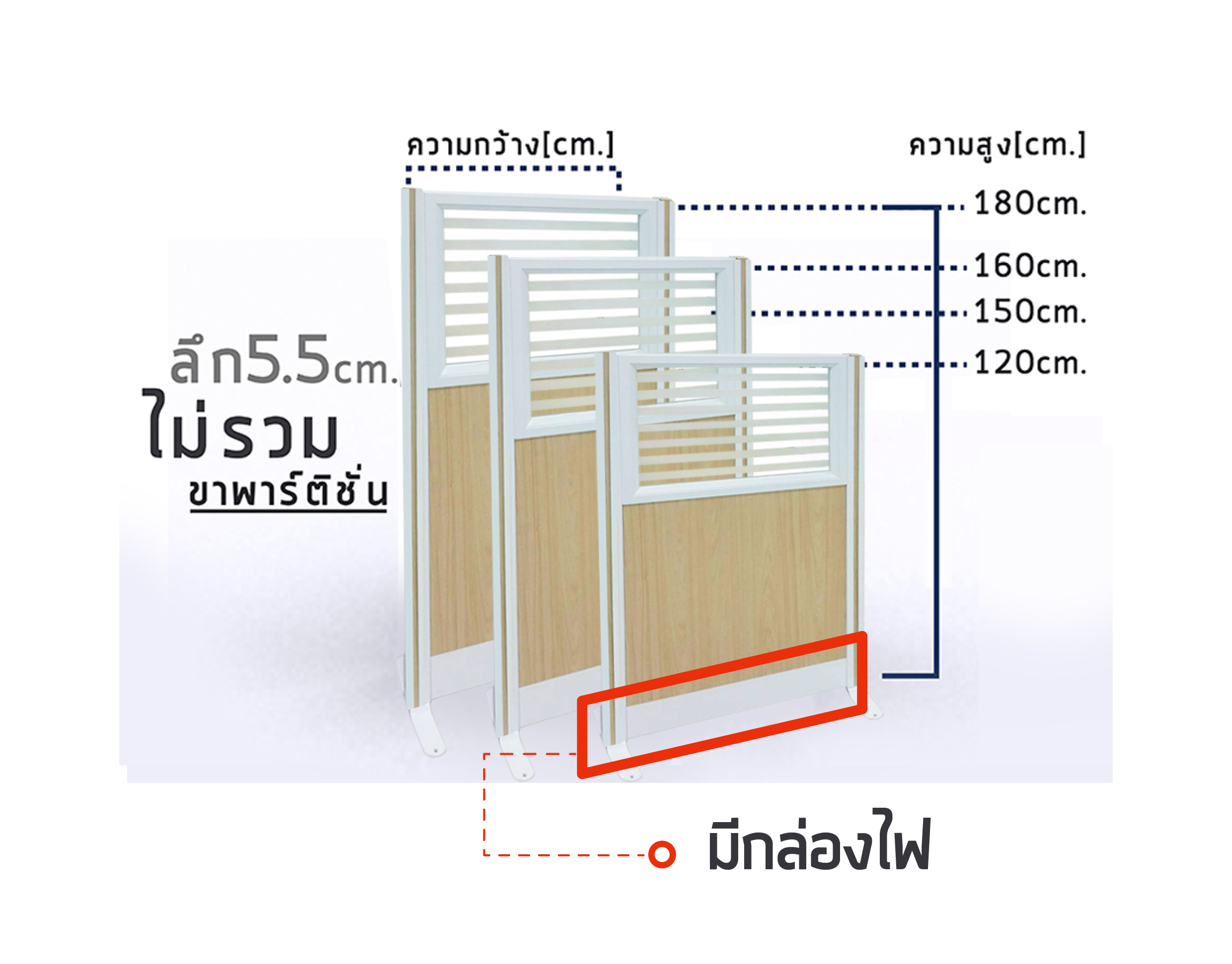 พาทิชั่น แบบครึ่งทึบ ไม้ ครึ่งกระจกใสขัดลาย มีเฟรมปิด มีกล่องไฟด้านล่าง มีหลายขนาดให้เลือก รหัส 3038