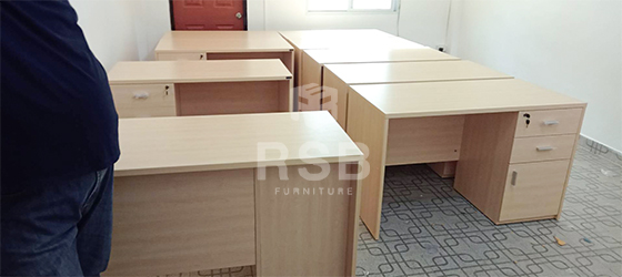 ภาพถ่ายจากหน้างานจัดส่งโต๊ะทำงานขาไม้ 2 ลิ้นชัก 1 บานเปิด รหัสสินค้า 3444 ในภาพลูกค้าสั่งผลิต ตู้ลิ้นชักทั้งฝั่งซ้ายและฝั่งขวา สำหรับวางเรียงชิดกำแพงทั้ง 2 ฝั่ง ด้านฝั่งลิ้นชักจะอยู่ติดกำแพง เป็นระเบียบมากค่ะ และเลือกโต๊ะเมลามีนสีบีชล้วนทั้งตัว