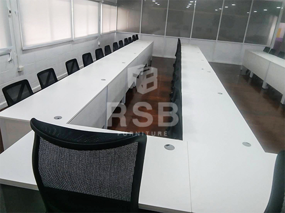 รีวิวภาพถ่ายจากหน้างาน หน้างานนี้ลูกค้าสั่งซื้อโต๊ะทำงานขาเหล็กตรง นำไปต่อเป็นโต๊ะประชุม รหัสสินค้า 2602 ได้สั่งผลิตแบบพิเศษ เสริมแผ่นบังหน้าตรงด้านข้าง สำหรับในการนำไปเรียงแถวยาวต่อกัน และนำปิดส่วนหัวและท้ายด้วยตัวที่สั่งเสริมแผ่นท๊อปด้านข้างค่ะ เลือกโต๊ะสีขาวล้วนรวมขาเหล็กด้วย และส่วนเก้าอี้เลือกใช้เป็นเก้าอี้พนักพิงตาข่าย รหัสสินค้า 5233 รุ่นนี้มีแผ่นซัพพอตที่หลัง นั่งสบายค่ะ
