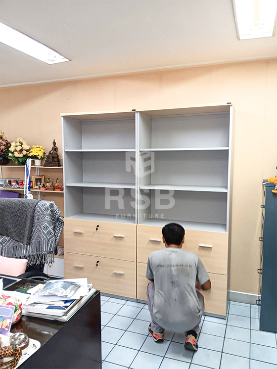 ภาพถ่ายจากหน้างาน บริเวณโซนเก็บเอกสารหลังโต๊ะทำงานในออฟฟิศค่ะ ลูกค้าสั่งซื้อตู้เอกสาร 2 ลิ้นชักใหญ่ด้านล่าง และ 3 ช่องโล่งด้านบน จำนวน 2 ตู้ ตู้เอกสารจะปิดผิวด้วยเมลามีน สามารถสั่งผลิตสีได้ ในภาพลูกค้าเลือกหน้าท๊อปสีเมเปิ้ลและส่วนอื่นสีขาวค่ะ รหัสสินค้า 2065