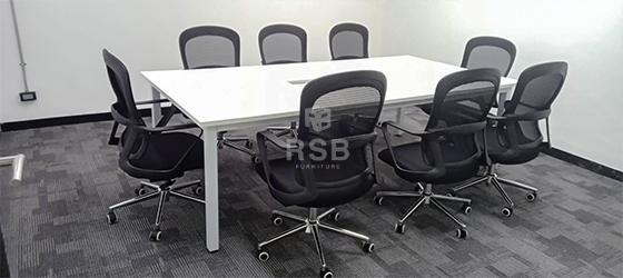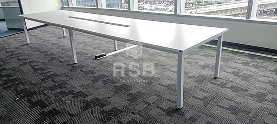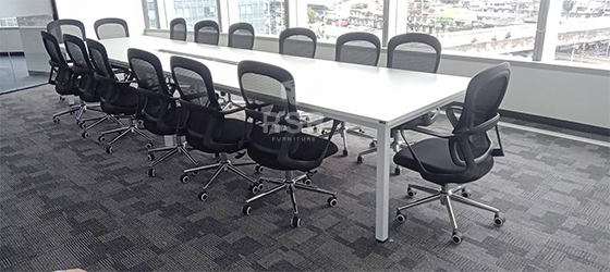 ภาพถ่ายจากหน้างานภายในห้องประชุม ลูกค้าสั่งซื้อโต๊ะประชุม ตัวต่อ ขาเหล็กกล่อง รหัส 3529 พร้อมกับเก้าอี้นั่งประชุม รหัส 4674 โต๊ะประชุมเลือกใช้เป็นขนาด กว้าง 480 ลึก 120 สูง 75 ซม. และสั่งเจาะรูสำหรับรอดสายไฟตรงกลางเพิ่มด้วย สีโต๊ะเลือกสีท๊อปและขาเหล็กสีขาว เก้าอี้นั่งประชุมเลือกใช้พนักพิงหุ้มด้วยวัสดุตาข่าย ระบายความร้อนที่หลังได้ดี นั่งสบาย ราคาไม่แพงด้วยค่ะ