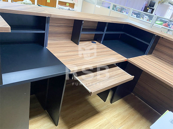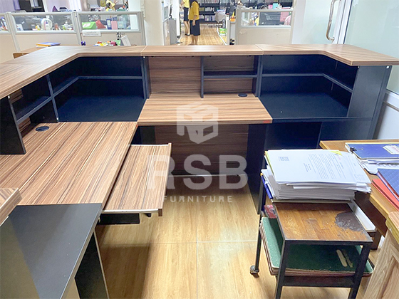ภาพถ่ายจากสถานที่นำเคาน์เตอร์สำนักงาน เมลามีนพิเศษลายไม้ WALNUT ขนาด W220 x D220 x H107 cm รหัส 1514 ไปจัดส่งและประกอบติดตั้งค่ะ รุ่นนี้เป็นเคาน์เตอร์ที่สวย และดีไซน์โด่ดเด่นเป็นเอกลักษณ์ของรุ่นนี้เลย ภายในมีรางคีย์ในตัวไม่ต้องติดตั้งเพิ่ม