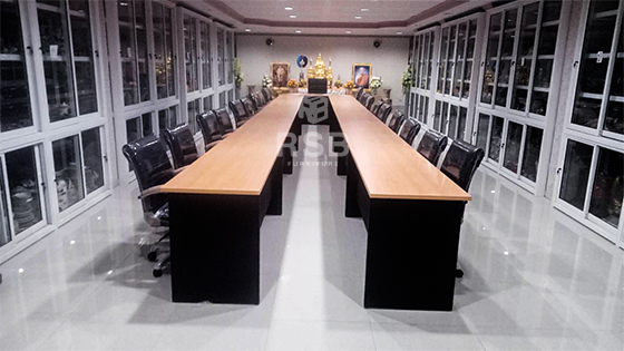 รีวิวภาพถ่ายจากหน้างานจริง นำโต๊ะประชุมตัวต่อ ขาไม้ และเก้าอี้สำนักงานไปจัดส่งและประกอบติดตั้ง โต๊ะประชุมขาไม้ตัวต่อ รหัสสินค้า 3559 ขนาดกว้าง 960 ลึก 180 สูง 75 ซม. จะนั่งได้ประมาณ 22 – 24 ที่นั่ง จะมีขนาด 180 x 60 ซม. จำนวน 11 ตัว รวมตัวหัวโค้งด้วยค่ะ ได้เลือกสีโต๊ะเมลามีนสีเชอรรี่ตัดกับสีดำ ส่วนเก้าอี้ที่ใช้นั่งประชุมเลือกใช้เป็นเก้าอี้สำนักงาน รหัสสินค้า 2226 รุ่นนี้หุ้มด้วยหนังทั้งตัว มีที่ท้าวแขน นั่งสบาย และยังเป็นรุ่นที่ขายดีอีกด้วย