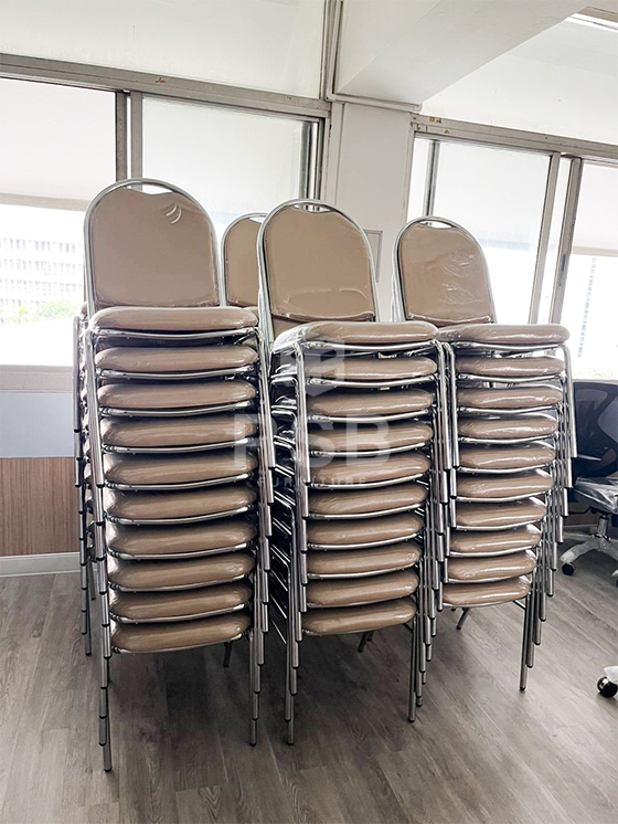 รีวิวภาพถ่ายจากหน้างานจัดส่งเก้าอี้จัดเลี้ยงสเปคเหล็กสั่งทำพิเศษ รับน้ำหนักได้ถึง 150 kg รหัสสินค้า 556 หน้างานนี้ลูกค้าได้เลือกสั่งซื้อเก้าอี้จัดเลี้ยงกับทาง RSB FURNITURE แต่สั่งขนาดพิเศษ ทั้งไซส์เก้าอี้และ ขนาดความหนาของเหล็กค่ะ เก้าอี้ขนาด กว้าง 44 cm ลึก 55 cm และสูง 90 cm โครงสร้างของขาเก้าอี้โครงสร้างที่นั่งและหลังพิง ผลิตจากเหล็กท่อกลมขนาด 7 หุน หนาไม่ต่ำกว่า 1.5 mm. โครงสร้างชุบโครเมี่ยมอย่างดี ขาเก้าอี้มีลักษณะเป็นทรง ขาคาดเอ (A) เหล็กหนารับน้ำหนักได้มาก เวลาซ้อนจัดเก็บขาไม่แอ่นกางออก และเลือกสั่งหุ้มหนัง สี PD315 ค่ะ