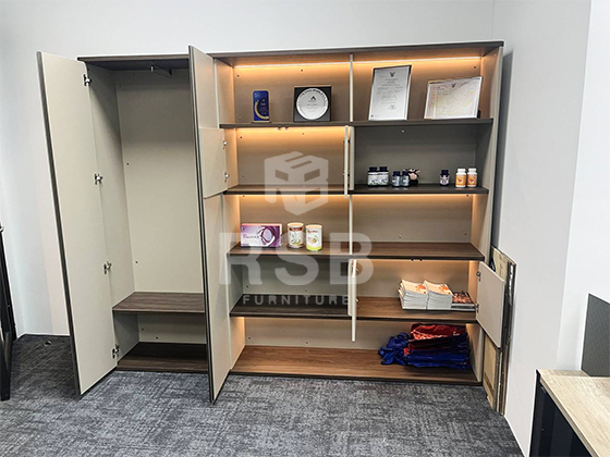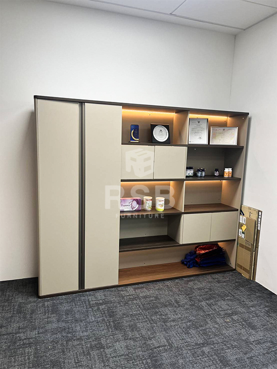 รีวิวภาพถ่ายจากหน้างานจัดส่งตู้เอกสาร ตู้โชว์ Sideboard ขนาดสูง 204 ซม. รหัสสินค้า 4805 รุ่นนี้ดีไซน์สวย ทันสมัย มีไฟ Led ซ่อนไว้ด้านบนของชั้น เวลาเปิดไฟ แล้ววางของโชว์ ของดูเด่นด้วยแสงของไฟ โครงตู้ทำจากไม้ MDF แข็งแรงรองรับหนักหนักได้ดีมากๆค่ะ