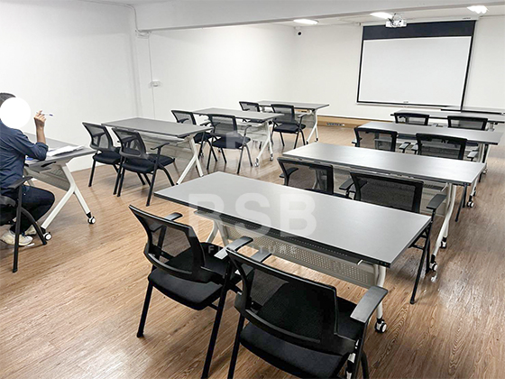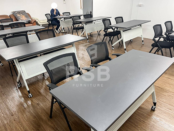 รีวิวภาพถ่ายจากหน้างานจัดส่งโต๊ะพับล้อเลื่อนพร้อมเก้าอี้แบบไม่มีล้อ 4 ขา รุ่นพับเบาะได้ ในภาพโต๊ะพับล้อเลื่อน รหัส 4712 มีชั้นวางของ แผ่นบังหน้าเหล็ก และเก้าอี้ใช้เป็น เก้าอี้ทำงาน เก้าอี้ประชุม พนักพิงตาข่าย เบาะพับเก็บได้ รหัส 4650