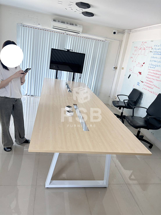 รีวิวภาพถ่ายจากหน้างาน จัดส่งโต๊ะประชุม ตัวต่อ ขาเหล็กกล่องหน้าใหญ่พิเศษ ทรงสามเหลี่ยม รหัสสินค้า 3526 ลูกค้าได้สั่งเจาะรูใส่รางไฟ แบบยาวขนาด กว้าง 100 cm รหัส 4829 จำนวน 2 จุด กลางท๊อป และสั่ง กล่องปลั๊กไฟ ที่ใช้คู่กับรางไฟ 2 แบบ มี รหัส 4831 USB 2 และ รหัส 4824 power 1 ใช้เสียบบนรางไฟ เลื่อนไปมาได้ทั้ง 2 รุ่นค่ะ