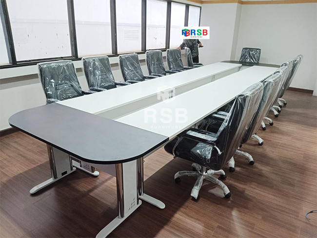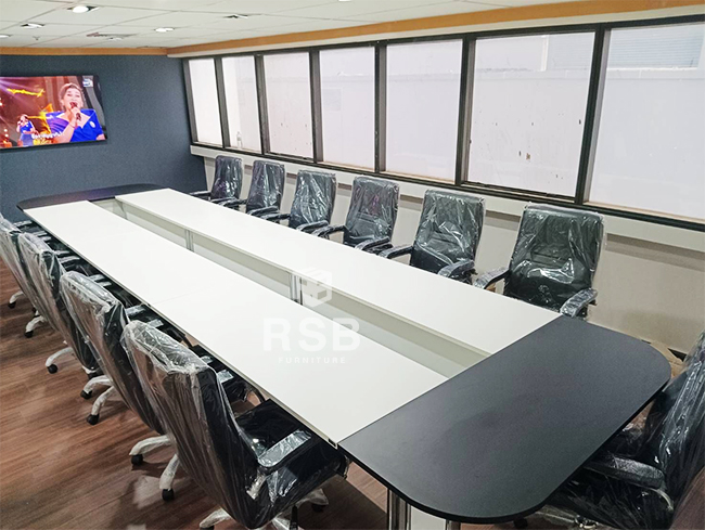 รีวิวหน้างานจัดส่งโต๊ะประชุมพร้อมเก้าอี้ค่ะ เป็นโต๊ะประชุมแบบตัวต่อ รหัส 3015 ลูกค้าเลือกสีโต๊ะในตำแหน่งผู้ร่วมประชุมเป็นสีขาว และส่วนหัวสำหรับประธานเลือกหน้าท๊อปเป็นสีดำ บังหน้าขาว ขาเหล็กปั้มเงาสีขาว เพื่อให้เข้ากับสีพื้นของห้อง โมเดิร์นมากค่ะ สวยมากๆค่ะ พร้อมใช้กับเก้าอี้สำนักงาน รหัส 459 รุ่นนี้นอกจากจะสวยแล้วยังนั่งสบายอีกด้วยค่ะ