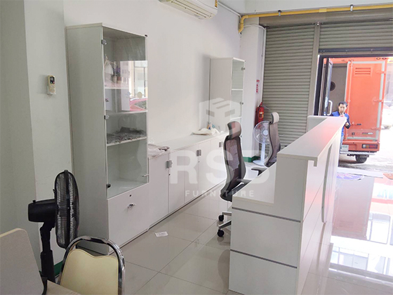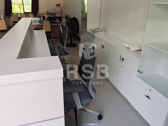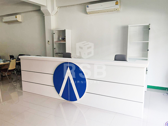 รีวิวภาพถ่ายจากหน้างานค่ะ หน้างานนี้ลูกค้าได้สั่งหน้าเคาท์เตอร์แบบพิเศษเป็นโลโก้ของบริษัทลูกค้าเอง สีน้ำเงินขาวค่ะ ได้สั่งเคาท์เตอร์จำนวน 2 ตัวมาต่อกัน สั่งขนาดเคาท์เตอร์ กว้าง175 x ลึก50 x สูง75-110 cm จำนวน 1 ตัวและเคาท์เตอร์ตัวแอล กว้าง175 x ลึก50 x และสูง75-110 cm จำนวน 1 ตัว มาต่อกัน เลือกด้านหน้าเคาท์เตอร์สีขาว และคาดด้วยเส้นอลูมิเนียม 2 เส้น ด้านในมีลิ้นชักทั้งหมด 2 ใบ 3 ลิ้นชัก เต็มถึงพื้น แบ่งเป็นฝั่งละ 1 ใบ พร้อมกุญแจล็อค และถาดคีย์บอร์ด