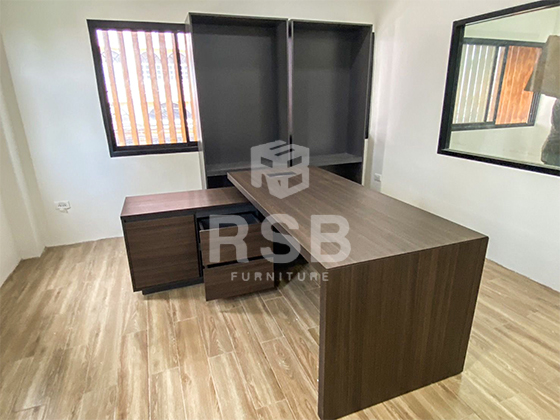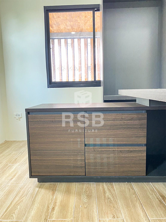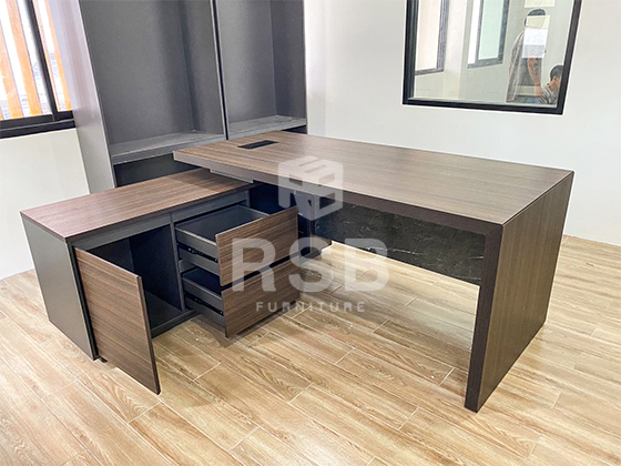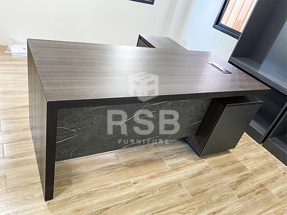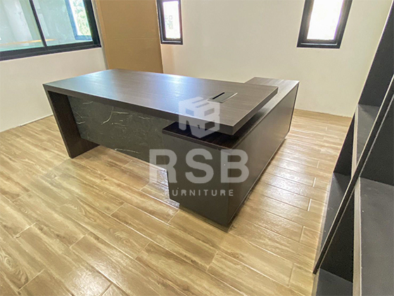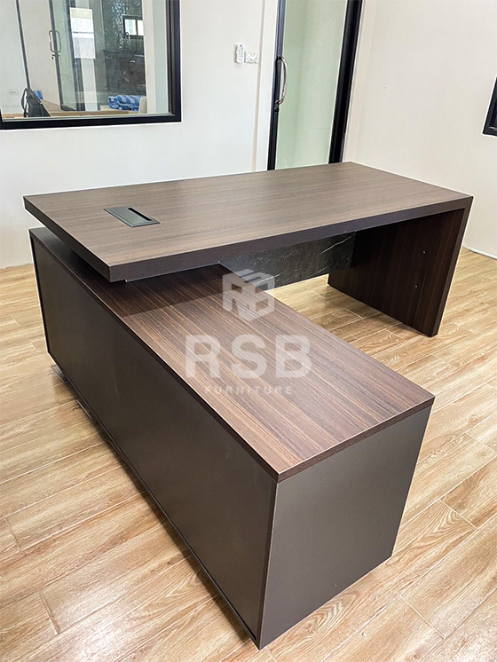 นำภาพถ่ายจากหน้างานที่นำโต๊ะผู้บริหาร ตัวแอลไปจัดส่งมาฝากค่ะ ในภาพเป็นโต๊ะตัวแอลขนาดกว้าง 180 ลึก 160 ซม. ขาไม้หนา อีกข้างดีไซน์ตู้ไซด์บอร์ดข้าง 1 บานเปิด 2 ลิ้นชัก 1 ช่องโล่ง แผ่นบังขาด้านหน้า เป็นเมลามีนลายหินอ่อน ผิวของท๊อปเมลามีนสีพิเศษ เหมือนไม้ธรรมชาติ สวย บนท๊อปมีกล่องปลั๊กไฟพร้อมใช้งาน รหัสสินค้า 3549